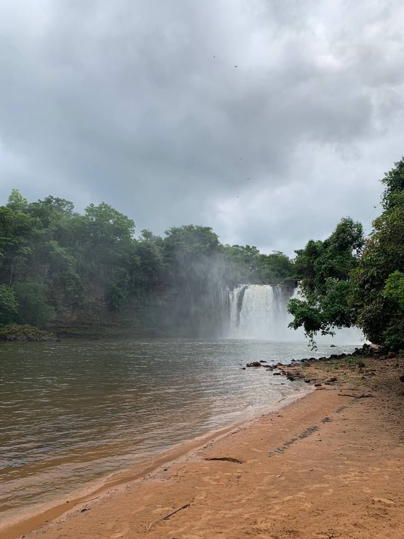 Partindo para as próximas cachoeiras — nesse caso, já fora do Complexo do Poço Azul —, visitamos a Cachoeira do São Romão, uma cachoeira enorme que você consegue acessar pela parte de trás e chegar bem pertinho. É uma sensação de recarregar as baterias quando você está diante de uma força tão grande e sente a água batendo no seu corpo e no seu rosto!