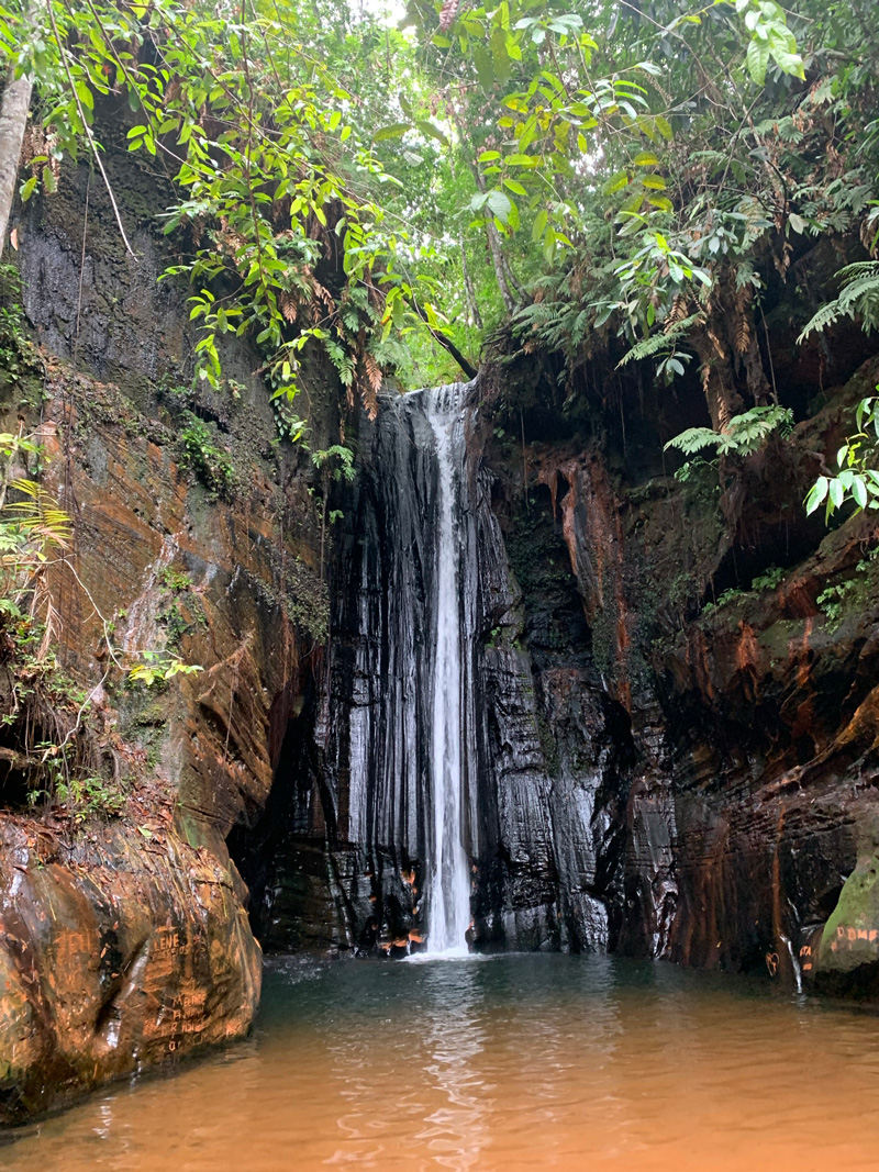 No outro dia, a programação seguiu para o Complexo da Pedra Caída, que tem cinco cachoeiras. Amanheceu chovendo bastante e tivemos que esperar um pouco para ir, mas nada que tenha atrapalhado o passeio. A primeira que conhecemos foi a Cachoeira do Santuário. Mesmo em um dia chuvoso, ela é muito bonita. Muito mesmo! Ficamos realmente impressionadas com a beleza daquele lugar.