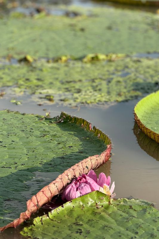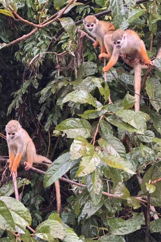 Durante a navegação pelo Arquipélago de Anavilhanas, botos-cor-de-rosa surgiram próximos ao píer flutuante, enquanto pirarucus quebravam a superfície da água com movimentos rápidos. Em outro trecho, macacos se deslocavam entre as copas das árvores às margens do Paraná do Ariaú, compondo cenas que acontecem sem roteiro fixo.