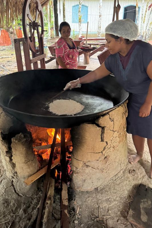 A programação seguiu com caminhada acompanhada por guia local, que explicou usos medicinais de plantas e compartilhou conhecimentos transmitidos entre gerações. Em uma casa de farinha, o grupo acompanhou o processo tradicional da mandioca e provou tapioca feita na hora.