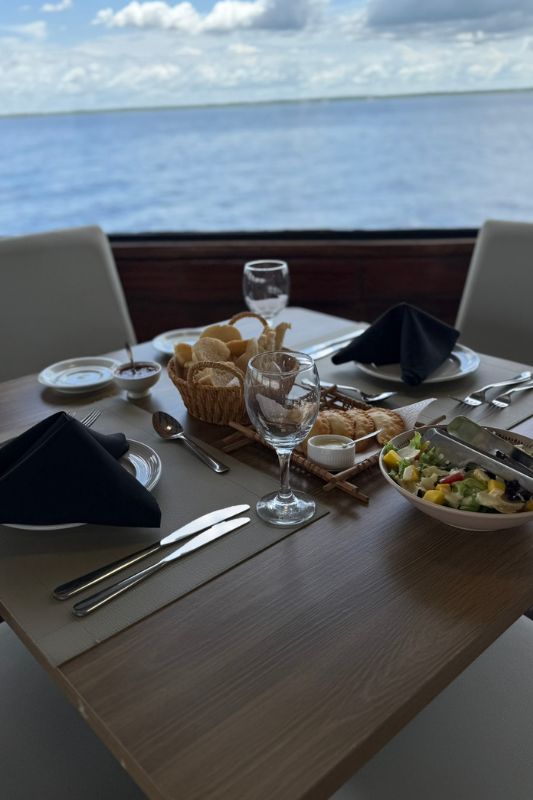 De volta ao barco após cada exploração, o restaurante panorâmico servia pratos inspirados na culinária amazônica, com peixes regionais, frutas locais e ingredientes típicos preparados com técnica e uma apresentação impecável.