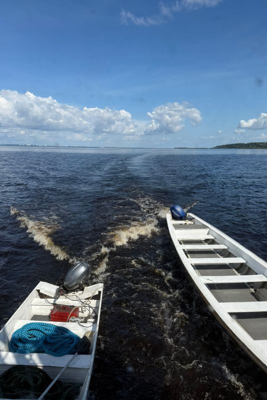 A viagem já começou com muita emoção e expectativa. Após as boas-vindas da tripulação e as orientações do capitão, o barco deixou o porto em direção ao famoso Encontro das Águas. Ali, o contraste entre os rios anunciava que a vivência seria marcada por transições: de cores, de sons, de temperatura e de paisagens.