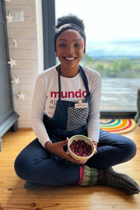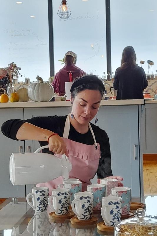 Tomamos chá e comemos murta (olha essa frutinha saborosa marcando presença de novo!) como aperitivo. Em seguida, uma sopa de mandioca, depois as empanadas que preparamos e, como prato principal, uma carne acompanhada de batatas. Como sobremesa, nossa empanada doce, que, modéstia à parte, ficou deliciosa! Também tivemos a grande felicidade de ouvir e apreciar uma das integrantes do grupo com sua linda voz.
